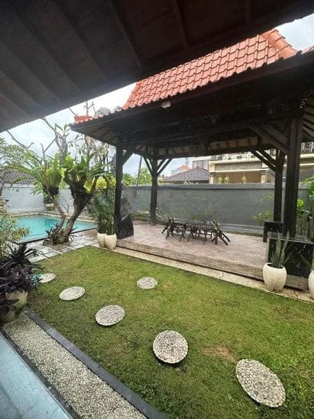 With a land area of 450m² and a building of 300m², this villa has 4 bedrooms and 3 bathrooms designed with a traditional Balinese touch. The outdoor area is equipped with a Balinese gazebo, private swimming pool, and a lush green garden. The interior offers a spacious lounge, a kitchen complete with modern equipment, and onsite laundry facilities.