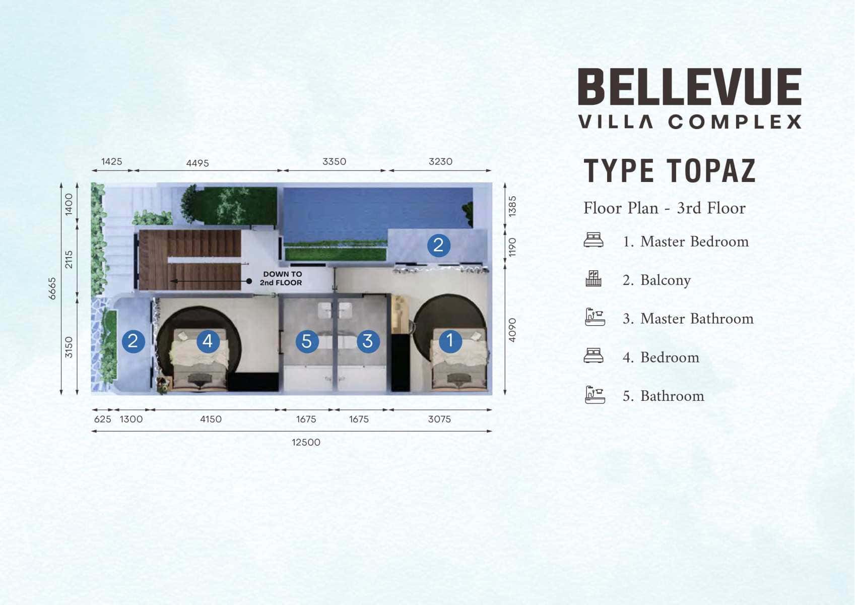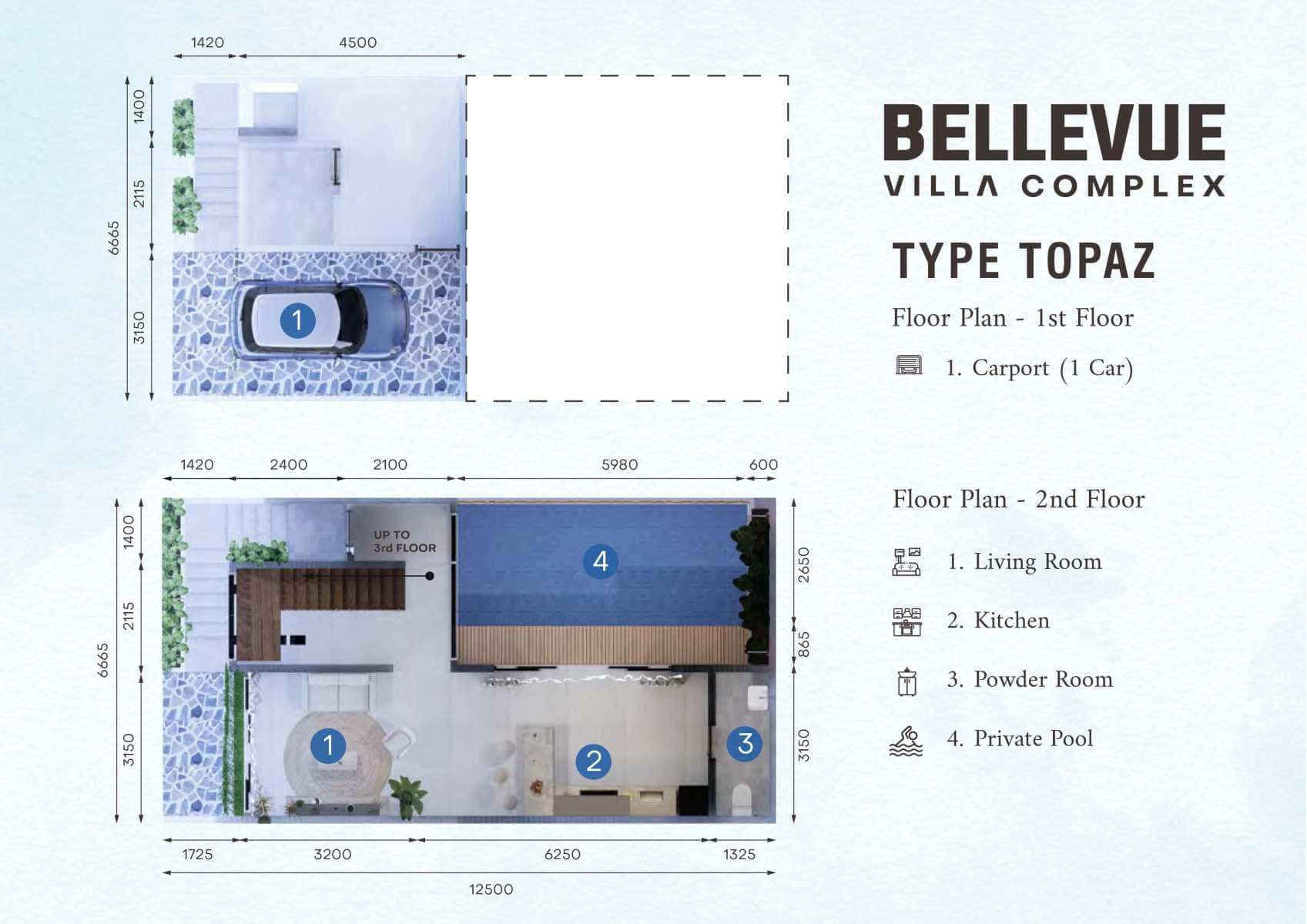 Setiap vila Tipe Topaz terdiri dari 3 lantai dan memiliki 2 kamar tidur yang luas. Kolam renang pribadi menambah sentuhan kemewahan, sempurna untuk hiburan dan relaksasi keluarga.
