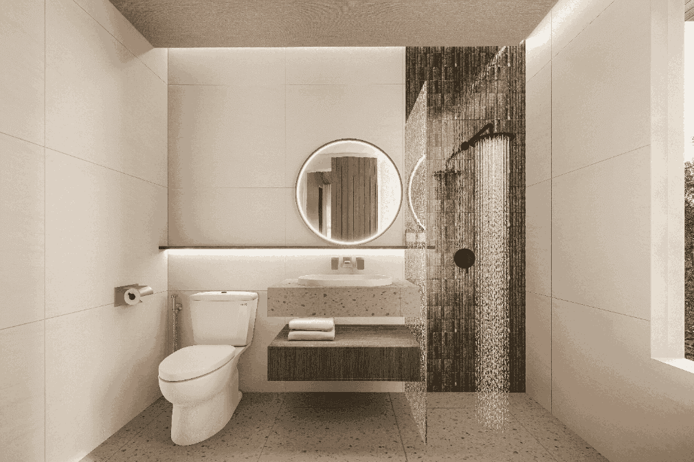 This two-story villa has a land area of 120m² and a building area of 100m², with dimensions of 6×20 meters. Equipped with two bedrooms and two bathrooms, it also offers a private swimming pool for added comfort. The villa’s design is available in four elegant styles Modern Tropical, Terracotta, Industrial, and Wabi Sabi, giving you the flexibility to choose the style that best suits your taste.